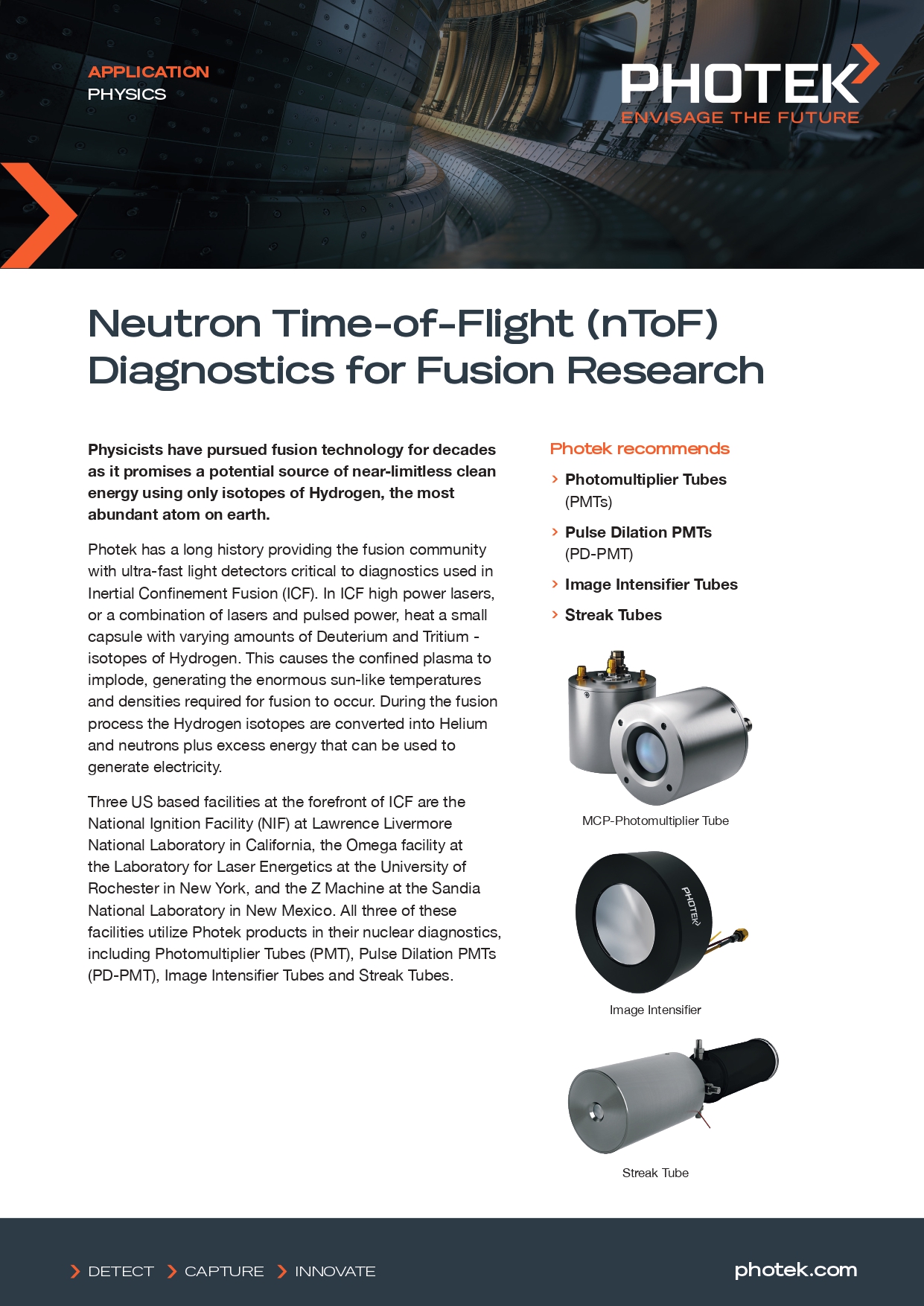 Combining fast response scintillator screens with Photek’s Photon Multiplier Tubes (PMT) enable the detection of neutron and gamma ray arrival with picosecond accuracy.